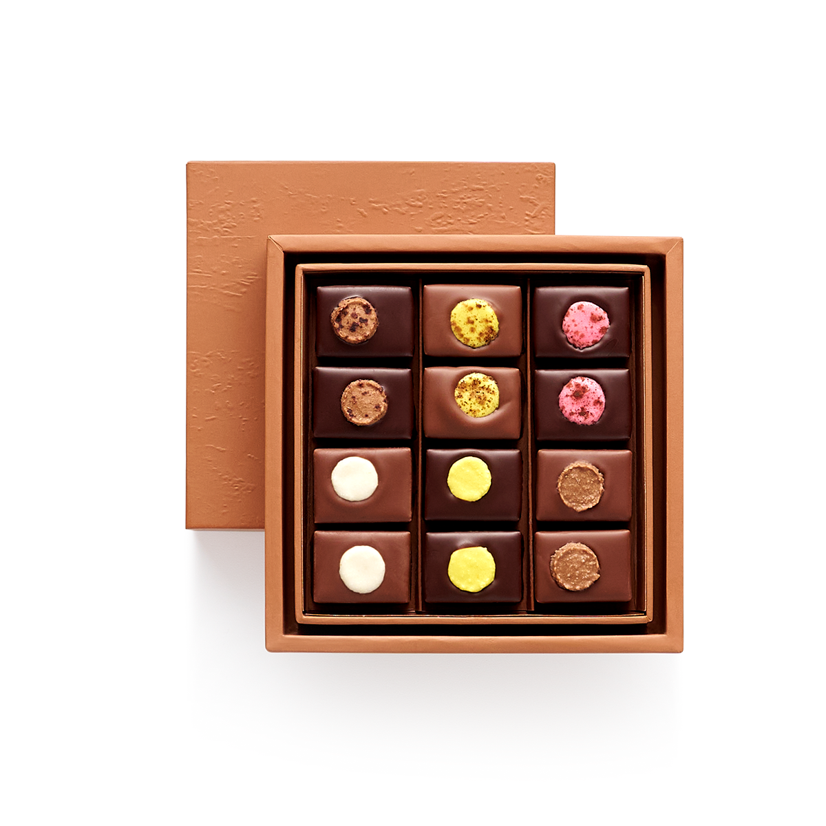 Pierre Hermé 精選手工巧克力以嚴選高品質可可製成,外層覆以64%黑巧克力與45%牛奶巧克力(皆採用純可可脂)。