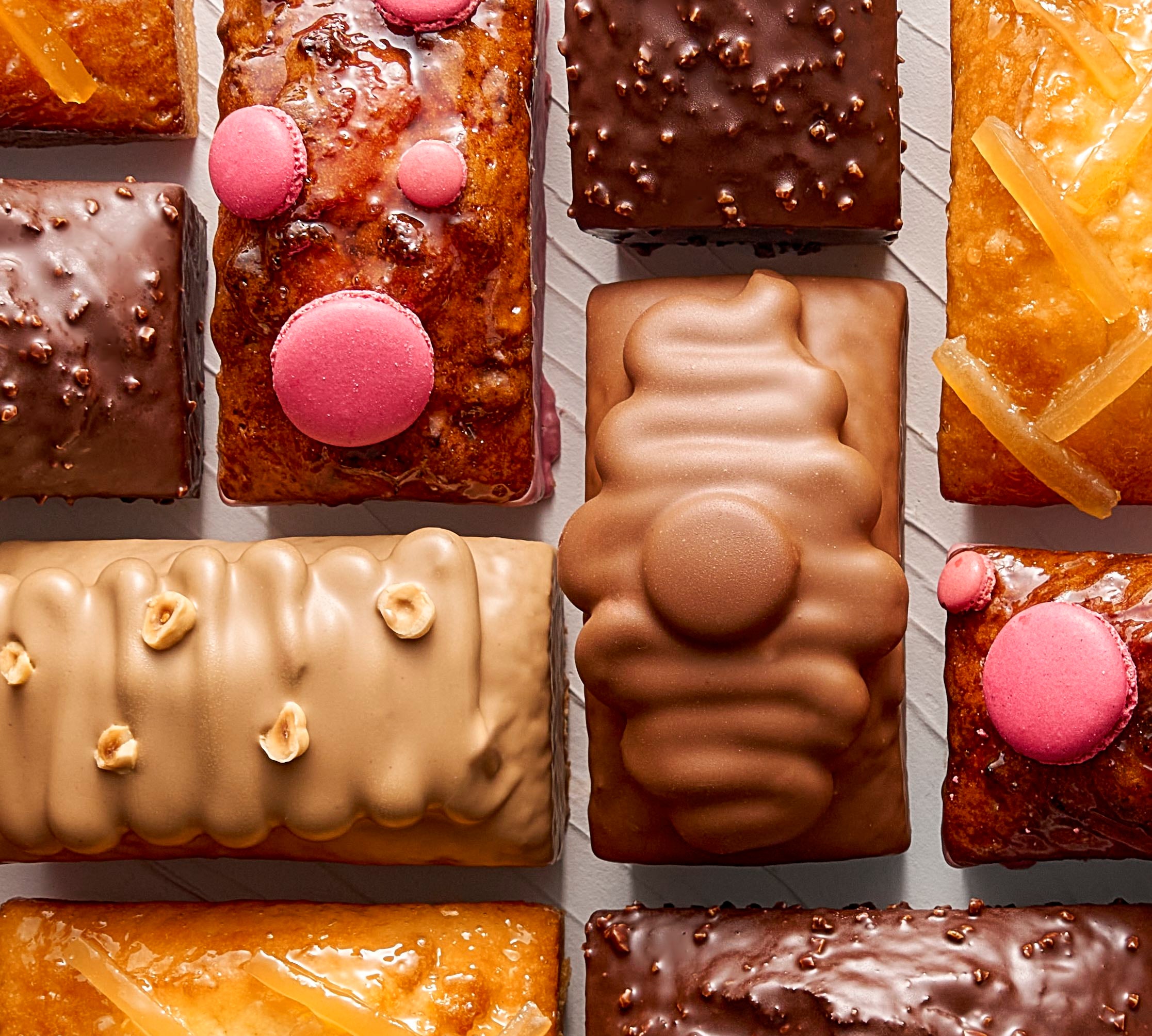 糖、可可豆、鮮奶油、杏仁、雞蛋白、奶油、水、可可脂、馬鈴薯澱粉、可可粉、海鹽、向日葵卵磷脂、香草萃取物、奶油、雞蛋白、複方濃縮物:蘋果和洛神花濃縮物、食用色素:薑黃色素、杏仁果、綠色開心果、銅葉綠素鈉、榛果、榛果漿、可可脂、香草粉、榛子漿、全脂奶粉、脫脂奶粉、鹿角菜膠、大麥萃取物、、百香果泥、轉化糖漿(蔗糖、果糖)、脂肪酸甘油酯、玫瑰香料、向日葵卵磷、酒石酸、果膠、著色劑:胭脂紅色素、抗氧化劑:維生素C、南瓜籽、葡萄籽油