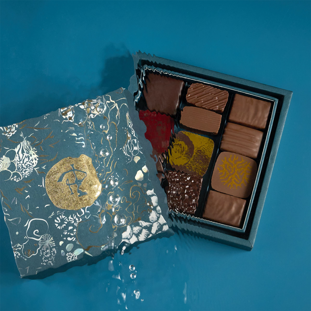 以嚴選高純度可可為基礎,外層以64%純可可脂黑巧克力與45%純可可脂牛奶巧克力細緻包裹。黑巧克力濃郁深邃、層次分明,與香醇柔滑的牛奶巧克力交織出完美平衡的風味,完整呈現品牌對可可工藝的極致追求。