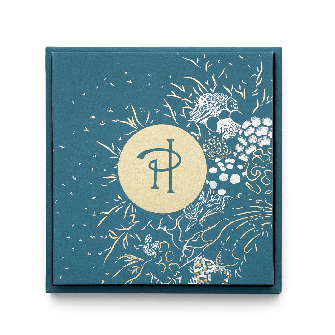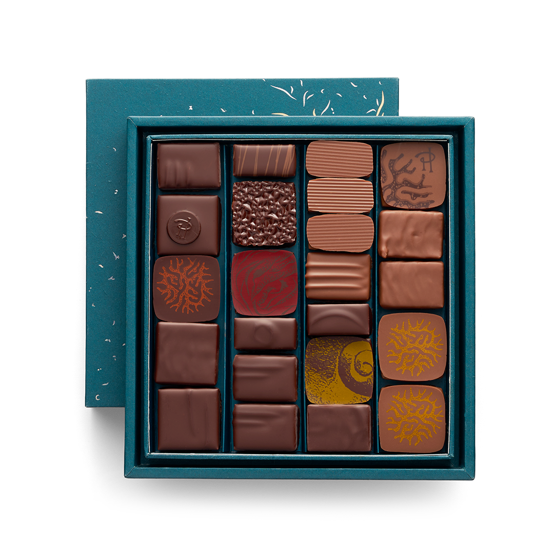 以純可可脂製成,嚴選含64%可可的黑巧克力與45%可可的牛奶巧克力層層包裹,成就細膩光澤與平衡香氣。濃郁可可風味在口中緩緩化開,帶出深沉與柔滑共存的絕妙口感,展現出品牌對可可純度與工藝的極致追求。