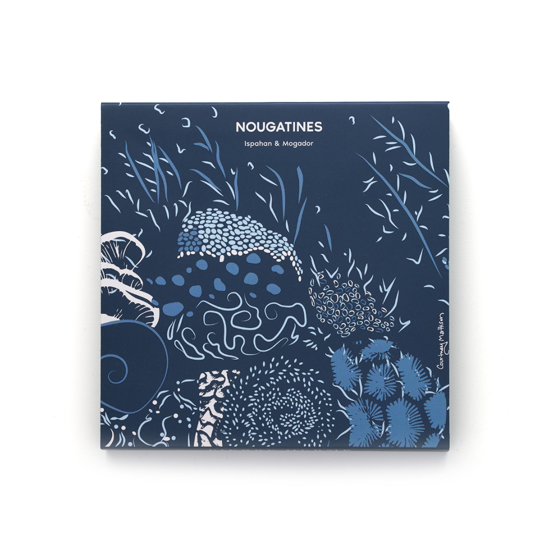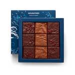 以64%黑巧克力與45%牛奶巧克力(均為純可可脂)細膩包裹酥脆牛軋糖,呈現絕妙的口感對比與和諧香氣。堅果的焦糖甜香融入濃郁可可,帶來層次分明的風味體驗。