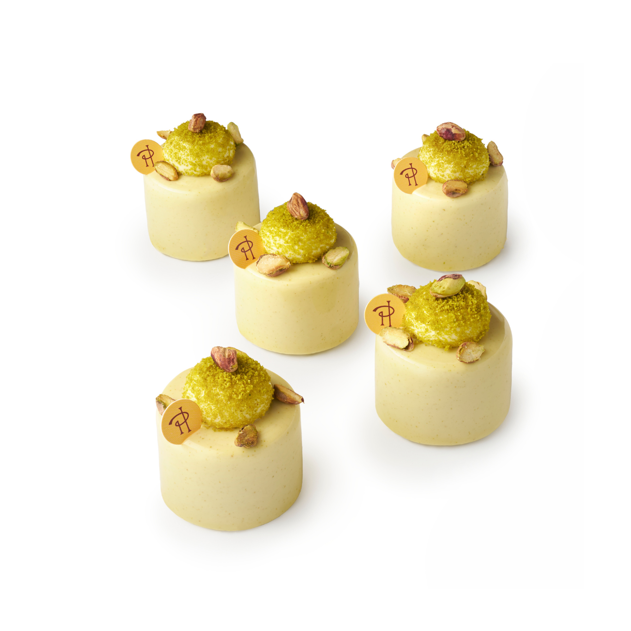 內層結合開心果慕斯、香滑奶霜與脆口榛果餅底,完美平衡濃郁與輕盈;香氣從柔和轉為深邃,微苦的堅果尾韻伴隨著奶香的圓潤感,構成細膩而持久的餘韻。